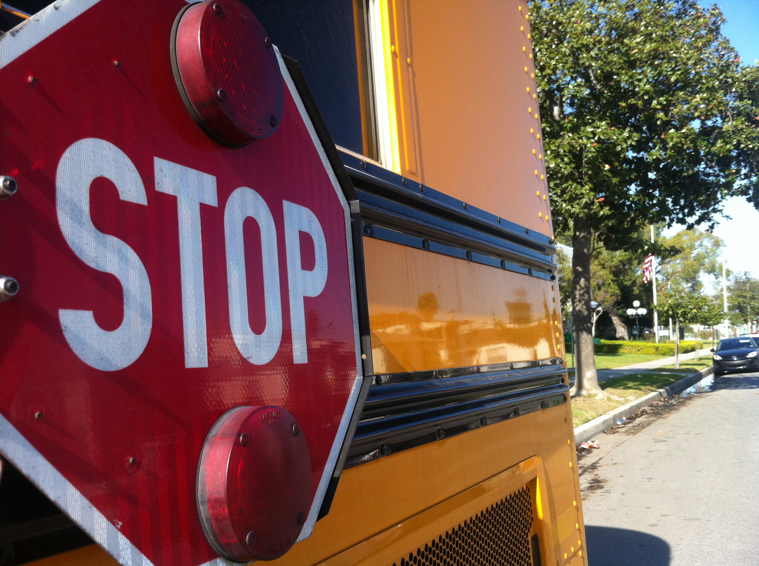 | A school bus parks outside Dorsey High School on Farmdale Ave. Tina Gutierrez photo. |